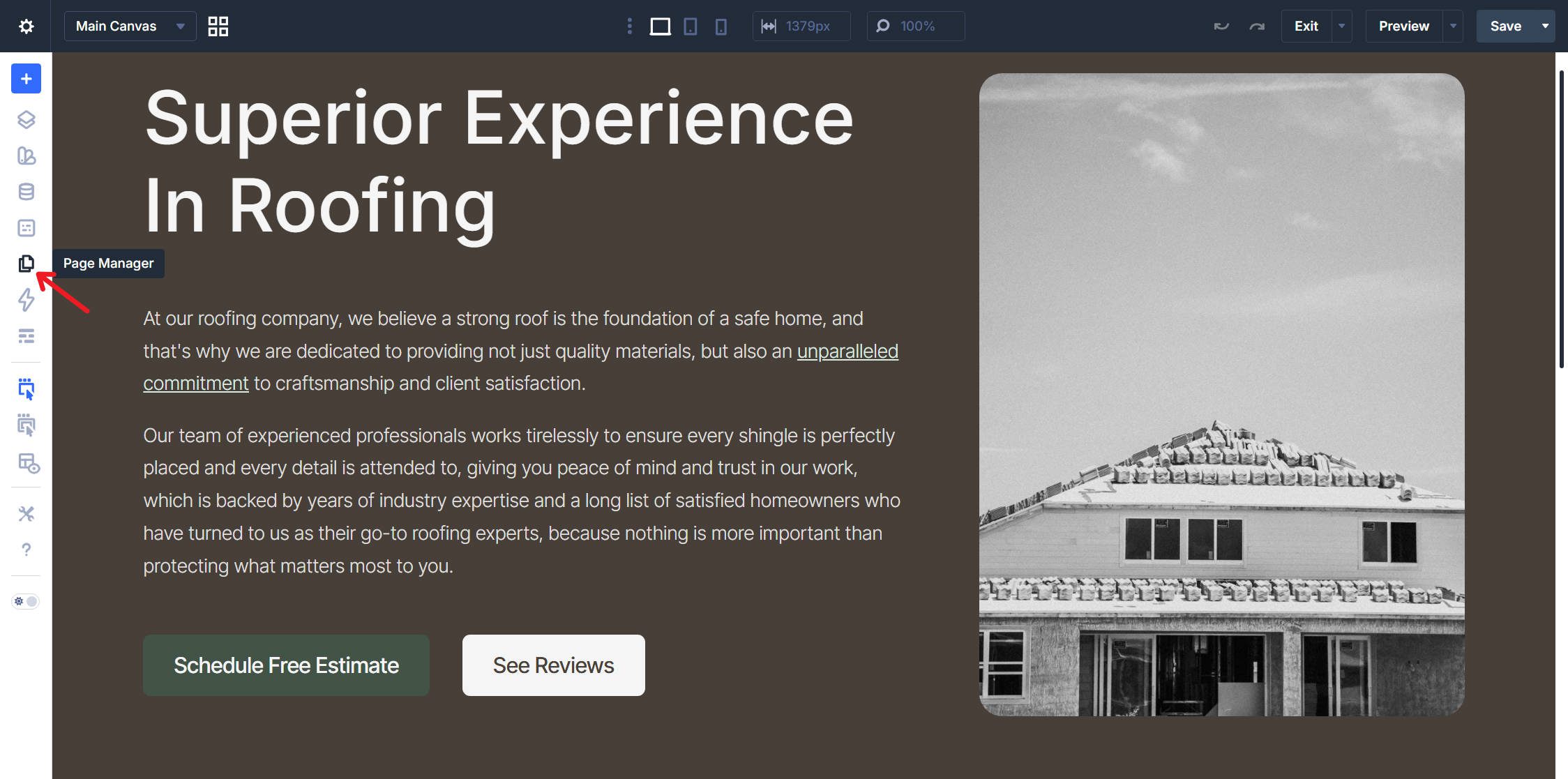 The Page Manager icon is located in the persistent left sidebar — the same sidebar that houses the Layers panel, the Design Variable Manager, and the layout tools. Clicking the icon opens the Page Manager panel on the left side of the builder interface.