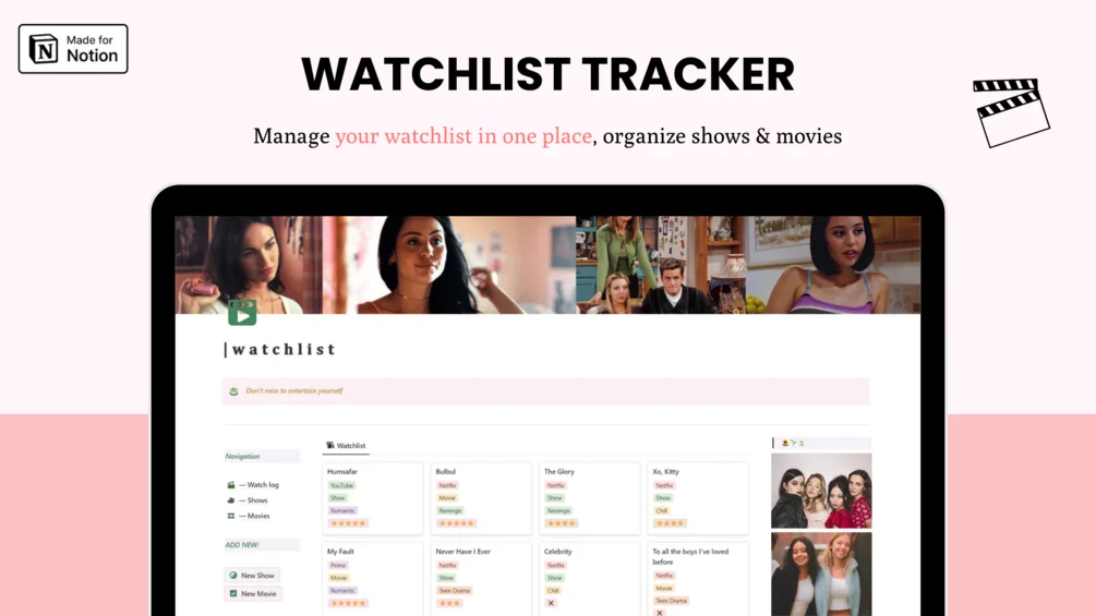 Notion templates Watchlist Tracker ( Aesthetic ) March 15, 2026 Monkey 3 Views 0 Comments Simplify your entertainment tracking journey with this Watchlist Tracker Notion template.In this Notion template, you can track the movies and shows you watch. This is an aesthetically designed wat… Source link