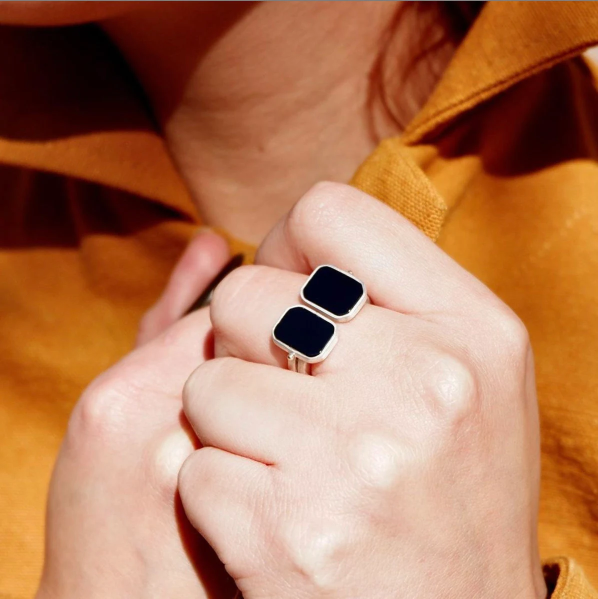 The silver Hypatia ring is hand forged by Micha using onyx and 14ct gold sourced from recycled materials. Photo by Micha González.