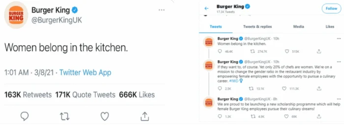 - Burger King UK’s “Women belong in the kitchen” commentary didn’t go off the way the brand planned. The company made this comment on X to promote a new scholarship program for female chefs. They went on to explain their original intent in the comments, but most people were focused on the insensitivity of the original post. It also didn’t help that the content team planned this to go out on National Women’s Day .