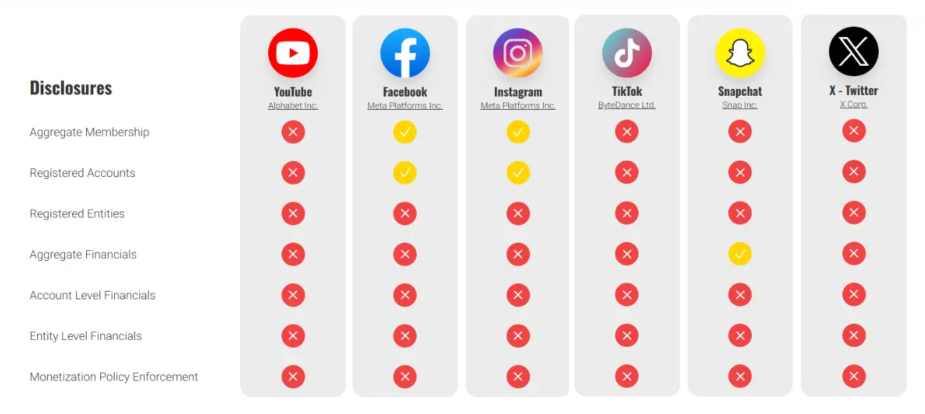 Only Meta’s platforms provide minimal information about the accounts that are part of the program and the total number of registered users. Meanwhile, Snapchat reports the total amount of revenue distributed among creators. The organization What To Fix shows the transparency comparison: