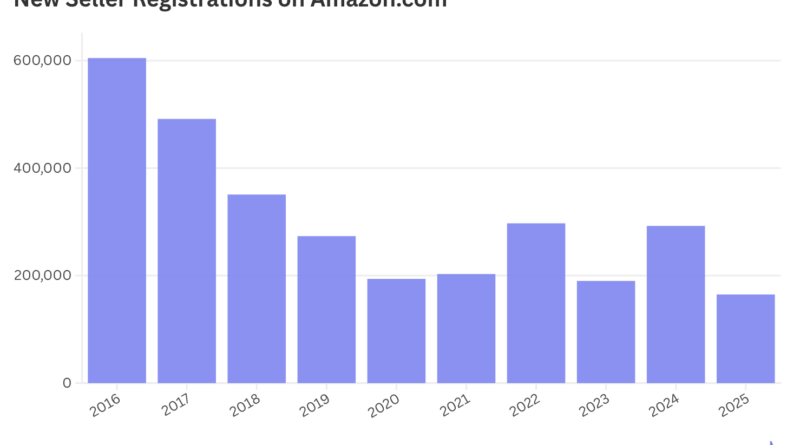 Read MoreAmazon.com registered just 165,000 new sellers in 2025, the lowest annual total since Marketplace Pulse began collecting data in 2015