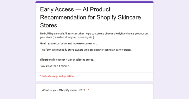 I’ve been going via a bunch of skincare Shopify shops not too long ago and seen a sample: Numerous merchandise look very comparable Prospects don’t actually know what’s proper for them In order that they both depart… or delay shopping for I’m considering of constructing one thing easy: A small AI assistant on the web site that: – asks just a few fast questions (pores and skin sort, considerations, and many others.) – recommends probably the most related merchandise – explains why that product matches Not attempting to behave like a “dermatologist” or change assist — simply assist prospects resolve sooner. Curious from precise retailer homeowners: